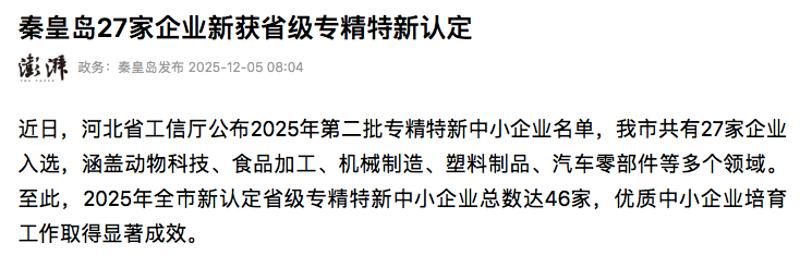 近日,河北省工信厅公布2025年第二批专精特新中小企业名单,秦皇岛市共有27家企业入选,涵盖动物科技、食品加工、机械制造、塑料制品、汽车零部件等多个领域。至此,2025年全市新认定省级专精特新中小企业总数达46家,优质中小企业培育工作取得显著成效。